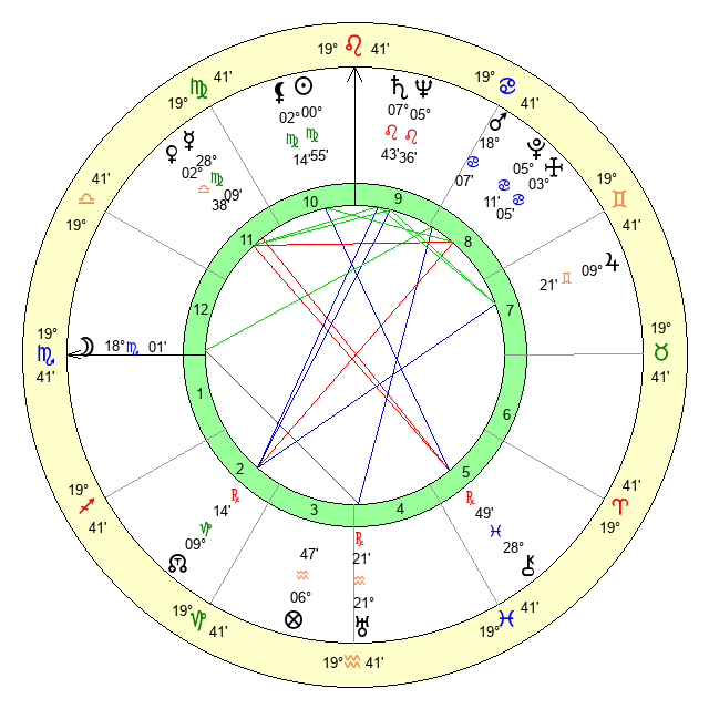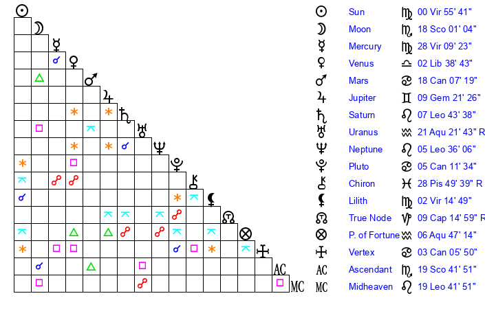 | Moon | 17 Scorpio 59 | 18 Virgo 54 | 3 Scorpio 40 |