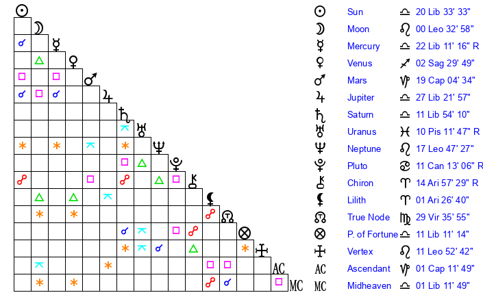 | Sun | 20 Libra 34 | 21 Libra 36 | 4 Aquarius 43 |
