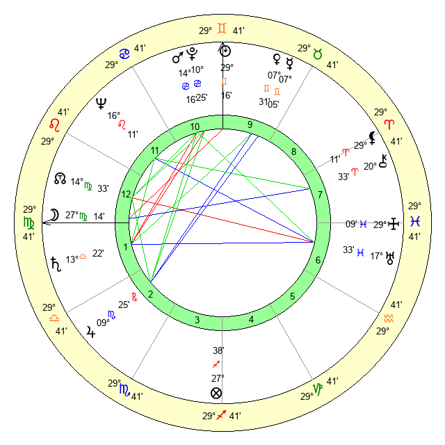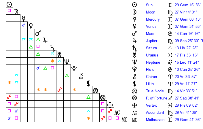 | Moon | 27 Virgo 16 | 9 Taurus 9 | 20 Gemini 20 |