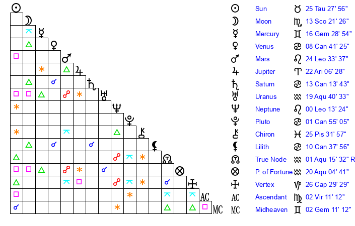 | Moon | 13 Scorpio 19 | 10 Capricorn 50 | 8 Scorpio 36 |