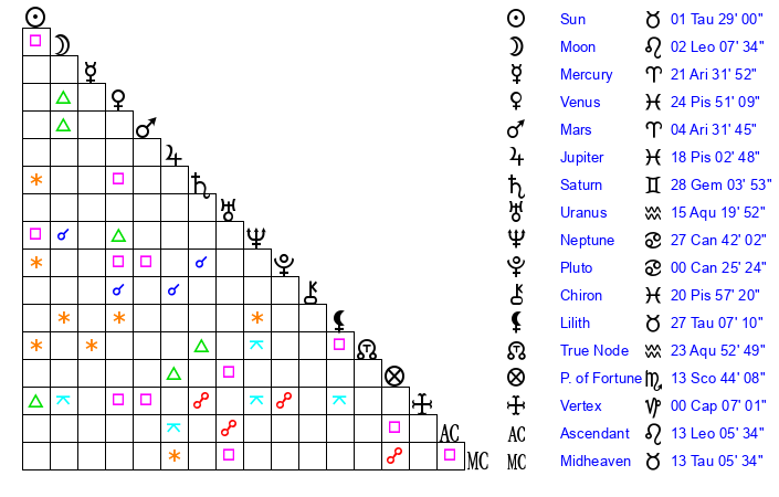 | Uranus | 15 Aquarius 17 | 25 Taurus 52 | 13 Aquarius 30 |