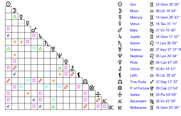 | Sun | 25 Gemini 39 | 26 Gemini 45 | 8 Libra 40 |