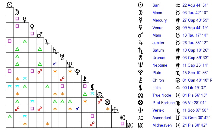 | Sun | 22 Aquarius 45 | 23 Aquarius 1 | 28 Pisces 52 |