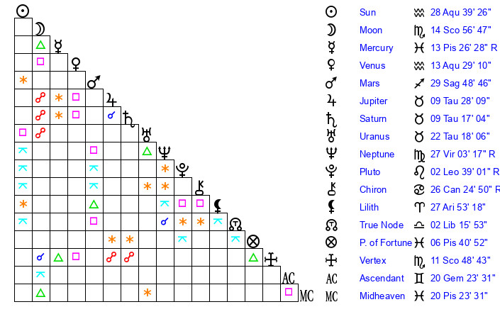 | Mercury | 13 Pisces 26 | 5 Pisces 55 | 29 Taurus 19 |