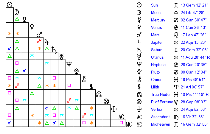 | Sun | 13 Gemini 12 | 14 Gemini 19 | 29 Virgo 48 |