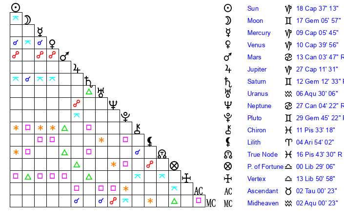 | Pluto | 29 Gemini 45 | 2 Aquarius 59 | 29 Gemini 30 |