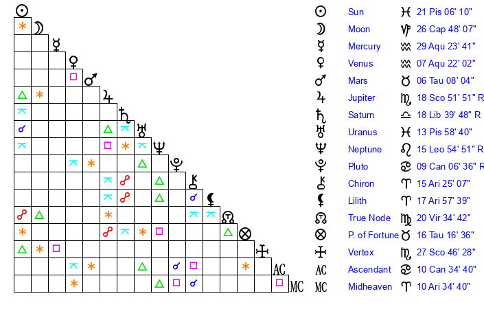 | Neptune | 15 Leo 54 | 29 Pisces 19 | 16 Leo 12 |