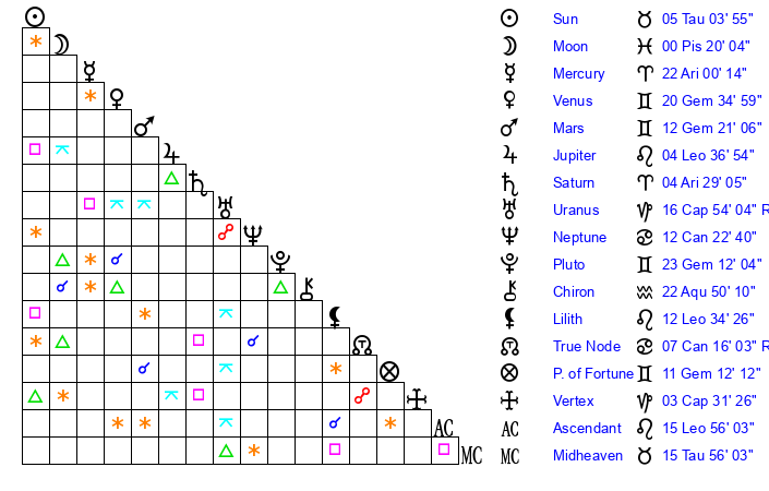 | Sun | 5 Taurus 4 | 5 Taurus 44 | 27 Leo 14 |