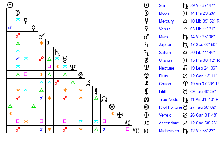 | Moon | 14 Pisces 22 | 21 Libra 57 | 3 Sagittarius 22 |