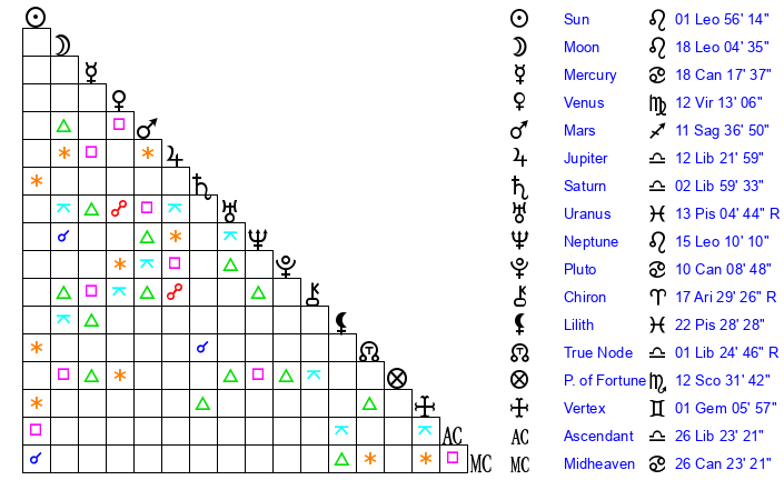 | Moon | 18 Leo 0 | 14 Leo 26 | 23 Taurus 5 |