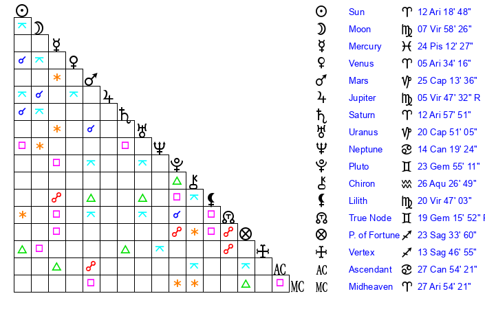 | Moon | 7 Virgo 54 | 12 Gemini 27 | 28 Scorpio 55 |