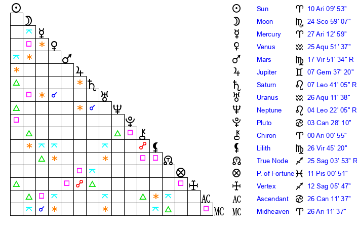 | Moon | 24 Scorpio 59 | 12 Taurus 59 | 28 Libra 10 |