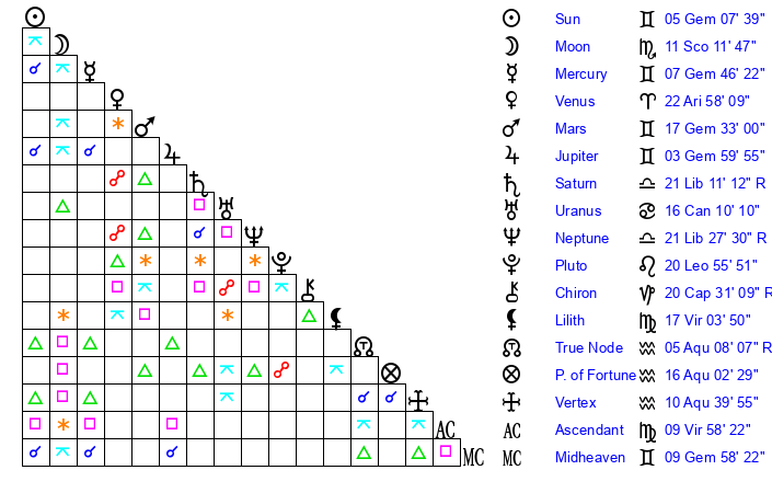 | Sun | 5 Gemini 7 | 5 Gemini 42 | 13 Leo 54 |