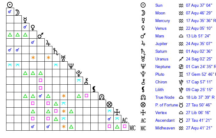 | Sun | 7 Aquarius 37 | 9 Aquarius 2 | 8 Gemini 5 |