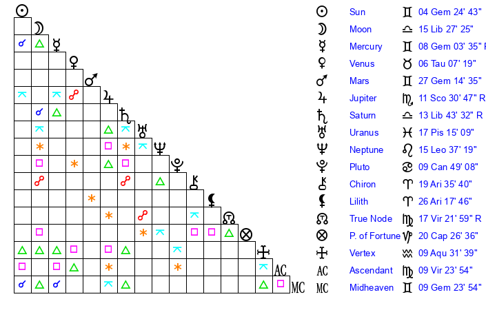| Moon | 15 Libra 36 | 29 Taurus 50 | 6 Cancer 43 |
