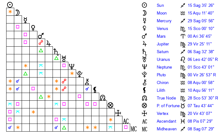 | Venus | 15 Scorpio 0 | 8 Sagittarius 38 | 11 Aquarius 4 |
