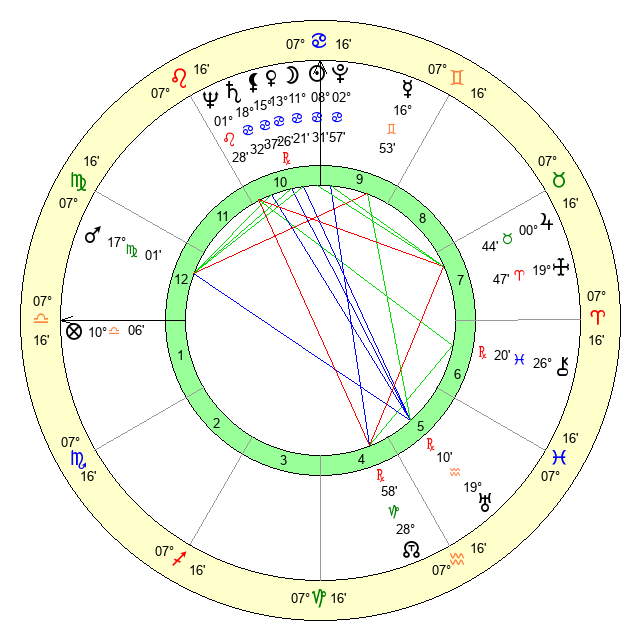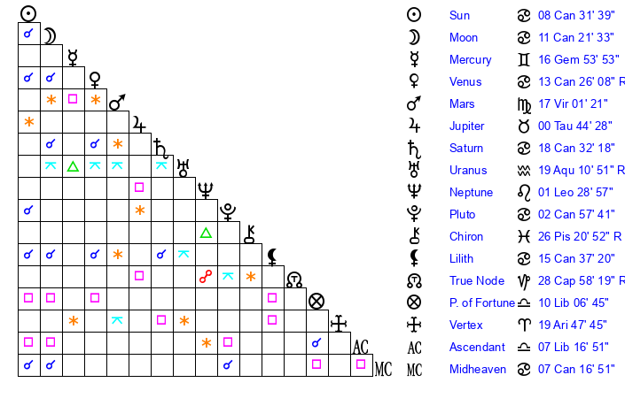 | Moon | 11 Cancer 20 | 15 Virgo 36 | 9 Cancer 34 |