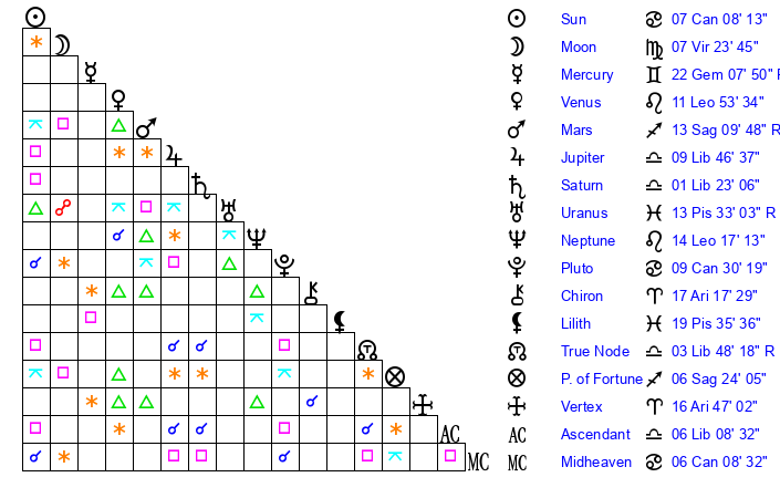 | Moon | 7 Virgo 25 | 2 Virgo 54 | 8 Gemini 22 |