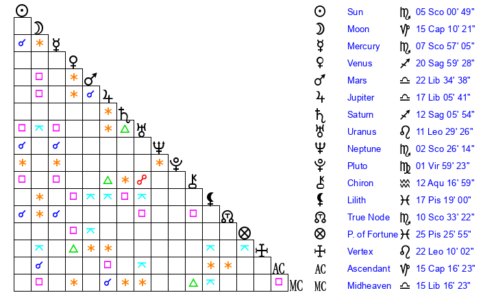 | Neptune | 2 Scorpio 26 | 29 Pisces 51 | 4 Scorpio 29 |