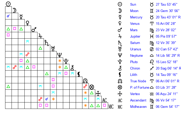 | Mercury | 20 Taurus 42 | 16 Taurus 23 | 0 Virgo 33 |