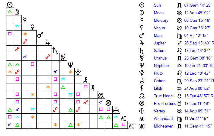 | Moon | 12 Aquarius 42 | 29 Gemini 42 | 13 Sagittarius 28 |