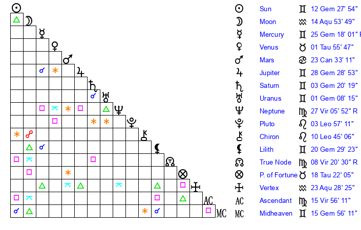 | Sun | 12 Gemini 28 | 13 Gemini 22 | 1 Virgo 51 |