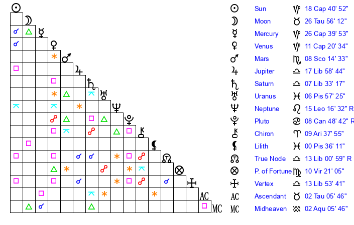 | Sun | 18 Capricorn 40 | 19 Capricorn 26 | 2 Taurus 45 |