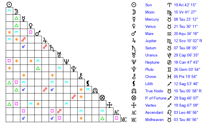 | Sun | 19 Aries 42 | 21 Aries 4 | 9 Leo 16 |