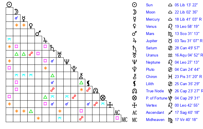 | Moon | 22 Libra 6 | 21 Sagittarius 31 | 15 Libra 49 |