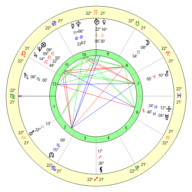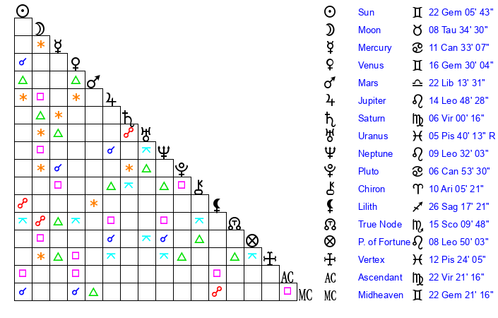 | Sun | 22 Gemini 6 | 22 Gemini 41 | 3 Libra 2 |