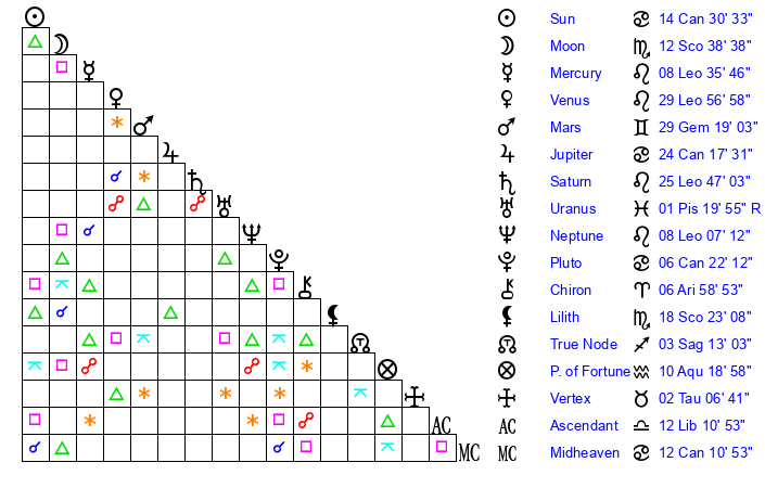 | Moon | 12 Scorpio 43 | 9 Sagittarius 30 | 3 Libra 4 |