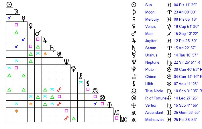 | Jupiter | 12 Pisces 23 | 11 Gemini 53 | 1 Aries 40 |