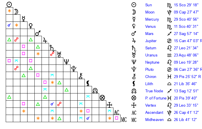 | Venus | 11 Scorpio 40 | 2 Scorpio 13 | 25 Pisces 50 |