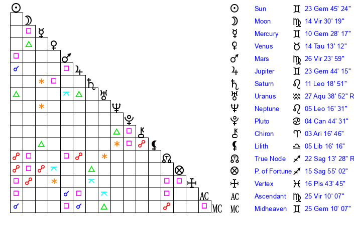 | Sun | 23 Gemini 45 | 24 Gemini 50 | 6 Libra 42 |