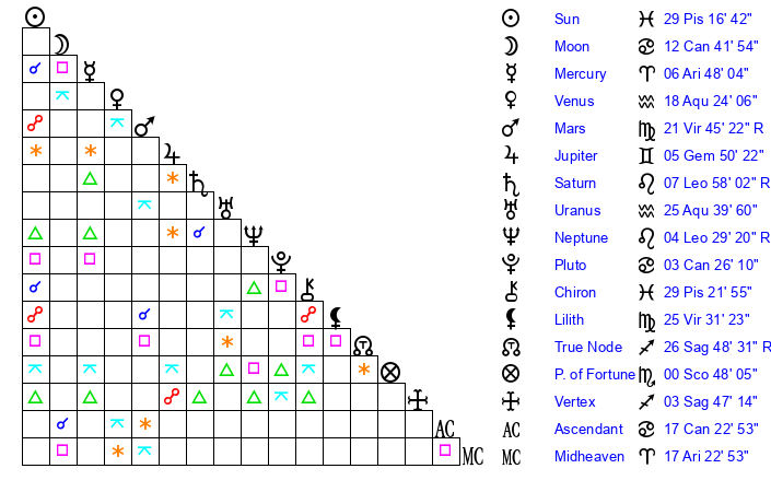 | Moon | 12 Cancer 43 | 10 Sagittarius 10 | 9 Gemini 37 |