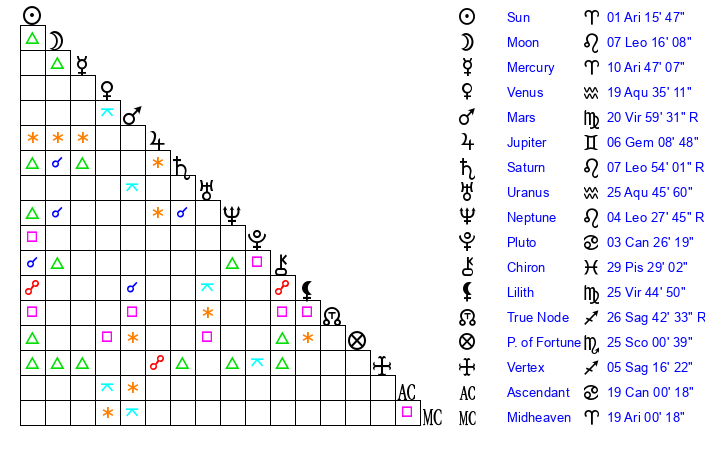 | Moon | 7 Leo 13 | 4 Capricorn 46 | 6 Cancer 43 |