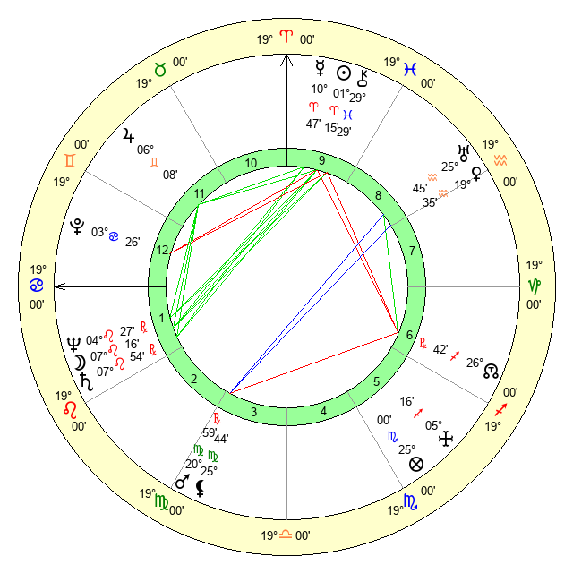 | Sun | 1 Aries 16 | 2 Aries 19 | 14 Cancer 44 |