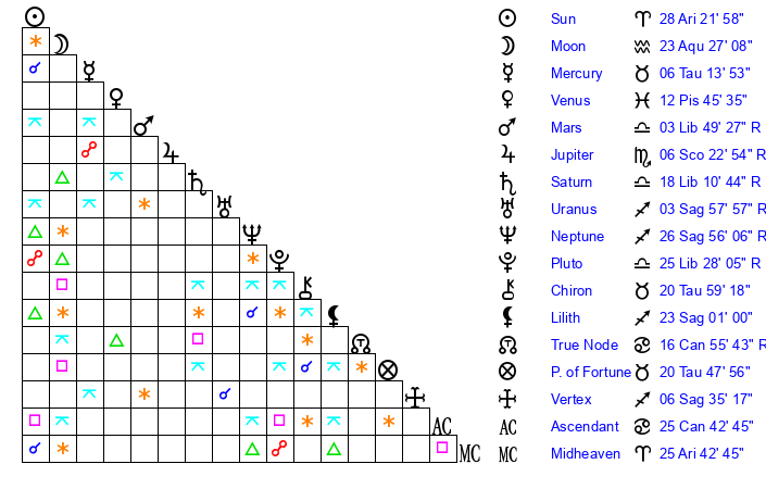 Sun | 28 Aries 22 | 28 Aries 57 | 9 Gemini 57 |