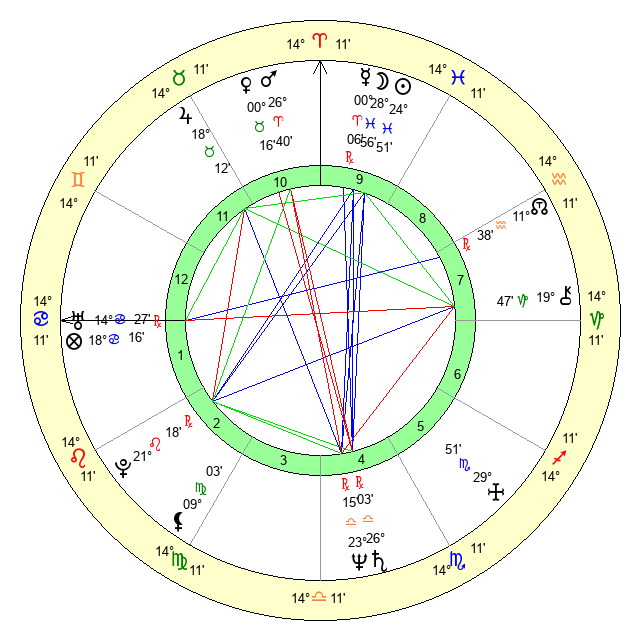 | Moon | 29 Pisces 2 | 11 Libra 21 | 11 Scorpio 43 |