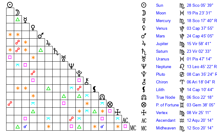 | Sun | 28 Scorpio 5 | 28 Scorpio 37 | 14 Pisces 35 |