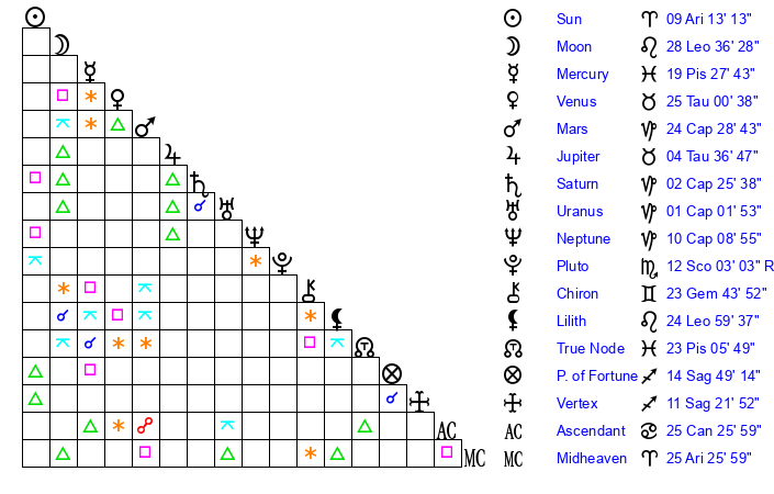 Sun | 9 Aries 13 | 9 Aries 15 | 15 Taurus 24 |