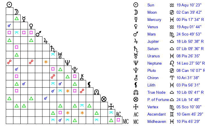 | Sun | 19 Aquarius 10 | 20 Aquarius 11 | 0 Gemini 48 |
