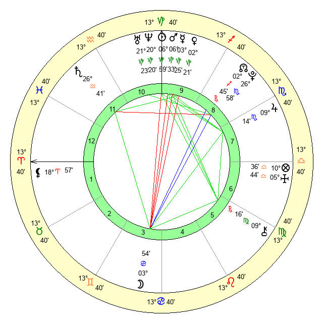 | Jupiter | 9 Scorpio 6 | 13 Gemini 34 | 13 Scorpio 3 |
