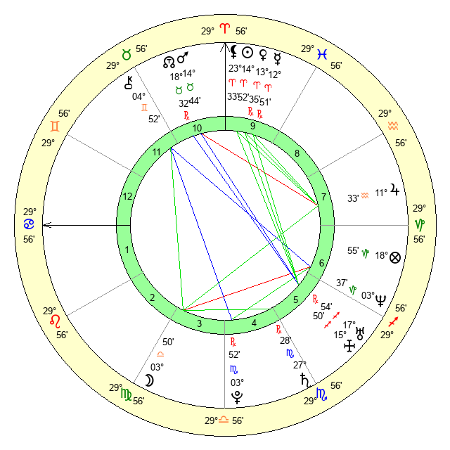 | Moon | 3 Libra 53 | 10 Cancer 26 | 27 Pisces 16 |