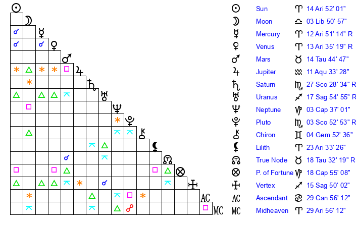 | Sun | 14 Aries 52 | 15 Aries 10 | 23 Taurus 50 |
