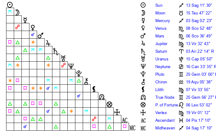 | Sun | 13 Sagittarius 12 | 13 Sagittarius 49 | 11 Aries 20 |