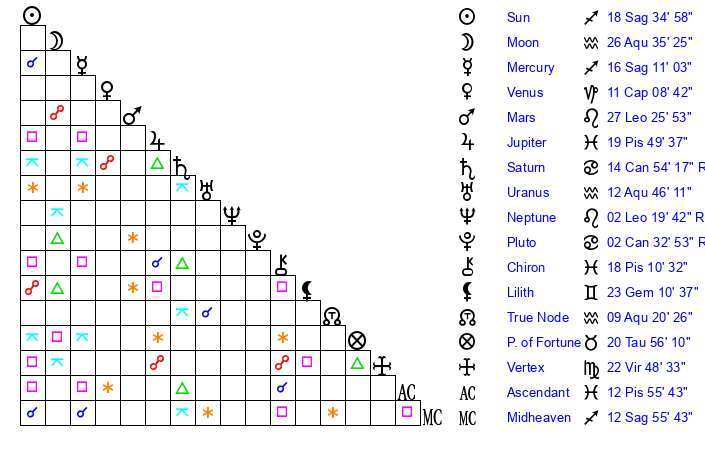 | Moon | 26 Aquarius 29 | 0 Taurus 49 | 18 Aquarius 16 |