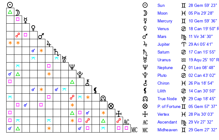 | Moon | 5 Pisces 29 | 24 Aries 37 | 27 Aquarius 2 |