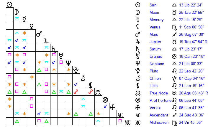 | Sun | 13 Libra 22 | 13 Libra 41 | 26 Sagittarius 44 |
