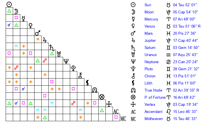 | Moon | 5 Capricorn 57 | 6 Aries 0 | 9 Aquarius 28 |